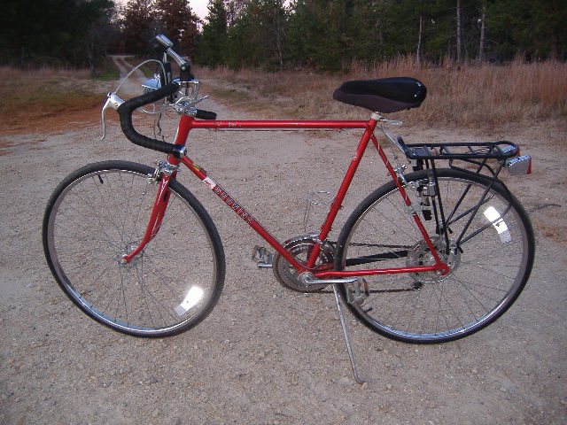 The crank was the only flaw. It was bent on the left side. After a visit to the Ant cave, I removed one from the old brown varsity. The spokes were all loose, and the rims warped and weird. After re-truing the rims by hand (no stand yet, I am on a tight budget) I set them in and checked them with a dial indicator mounted to the chainstays. With lots of rust removal on the rims, new tubes and tires, handlebar tape (for some reason the original Schwinn handlebar tape even in horrid condition photographs well), a planet bike rear rack, and some grease in the bearings... here it is.